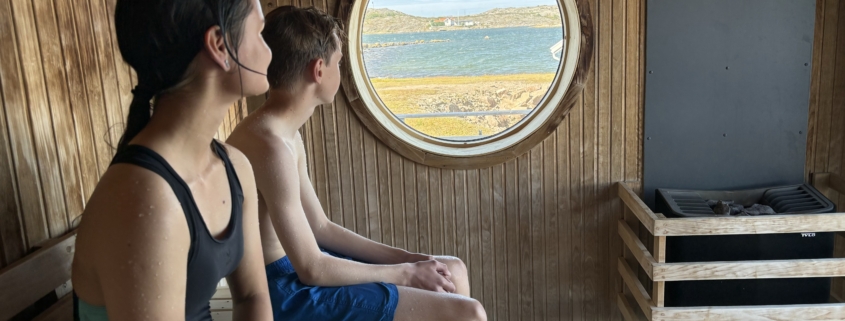 Utebastu med havsutsikt och möjligheten till havsdopp. I anslutning till bastun finns också 2 duschar och ett relaxutrymme där du kan sitta och slappna av.