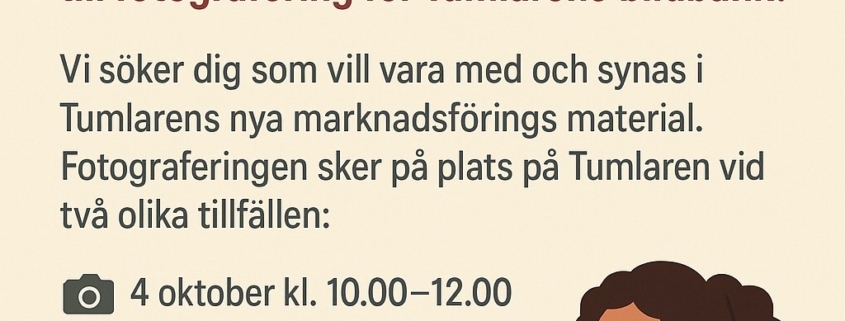 Vi söker dig som vill vara med och synas i Tumlarens nya marknadsföringsmaterial. Fotograferingen sker på plats på Tumlaren vid två olika tillfällen: